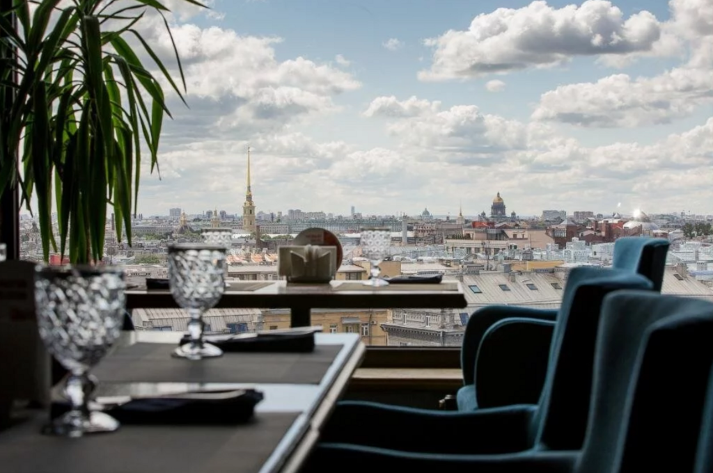 Ресторан находится на 10 этаже бизнес-центра «Толстой Сквер» и предлагает потрясающий вид на Санкт-Петербург с высоты птичьего полета. Здесь можно насладиться видом на купол Исаакиевского собора, шпиль Петропавловской крепости и другие знаковые объекты города. Здесь два зала с уютными уголками, контактной барной стойкой, зоной открытой кухни и детской комнатой. Для деловых переговоров предусмотрен VIP-кабинет. Интерьер оформлен лаконично и стильно с дизайнерскими светильниками, яркими диванами и зелеными растениями. Меню ресторана мультинациональное и включает блюда европейской, итальянской, русской, японской и паназиатской кухонь. Особое внимание стоит уделить стейкам, шашлыкам, домашней пасте и десертам, таким как тарт с голубикой и ванильный кекс с вишней.