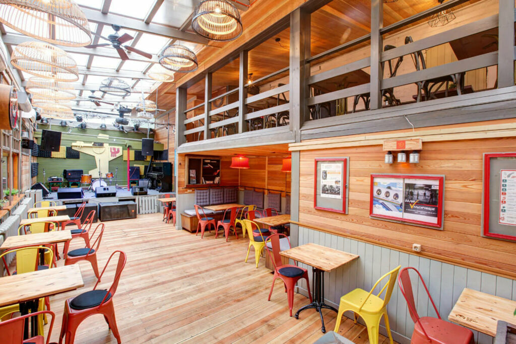 Интерьер напоминает атмосферу старого бункера: деревянные столы, обшарпанные стены и круглые светильники на цепях. Особенность заведения — оригинальная подача блюд: коктейли в пробирках, а еда в канистрах для топлива.