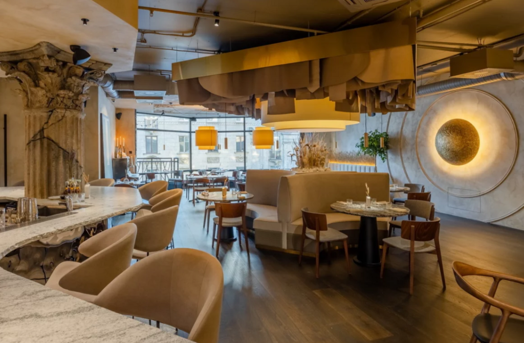 Sixty Four. Интерьер в теплых бежевых тонах с элементами кирпичной кладки создает спокойную и профессиональную атмосферу, что делает Sixty Four отличным выбором для деловых встреч. Здесь можно обсудить важные вопросы за ужином, наслаждаясь не только гастрономическими шедеврами, но и панорамным видом на реку Мойку.