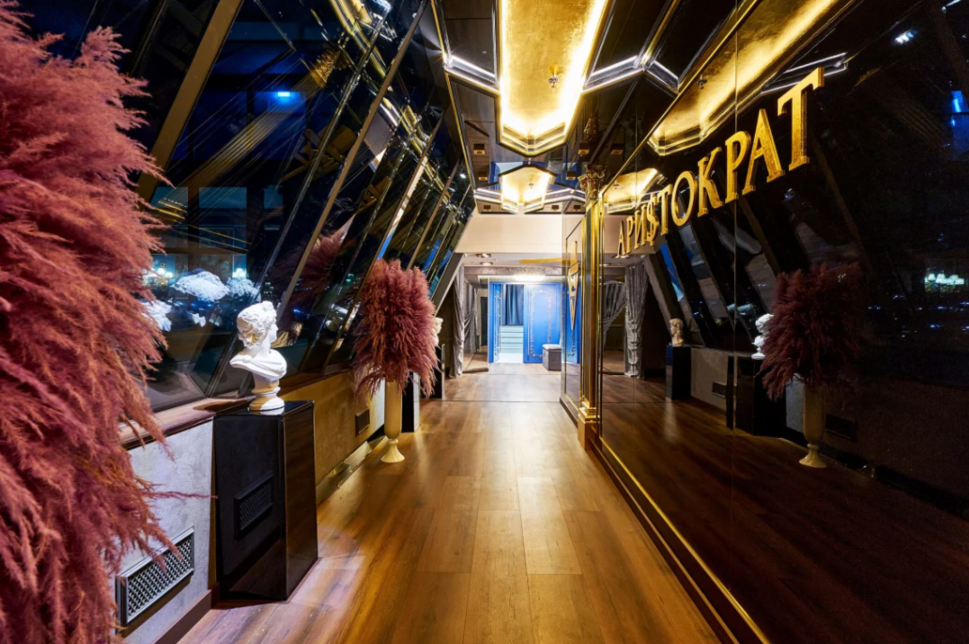 Ресторан «Аристократ» сочетает в себе изысканный интерьер и панорамные виды на небоскребы Москвы. Роскошный дизайн с многоярусными люстрами, глянцевыми поверхностями и зеркальными вставками создаёт неповторимую атмосферу. Полные окна ресторана открывают виды на деловой центр столицы, что добавляет особый шарм вечеру.