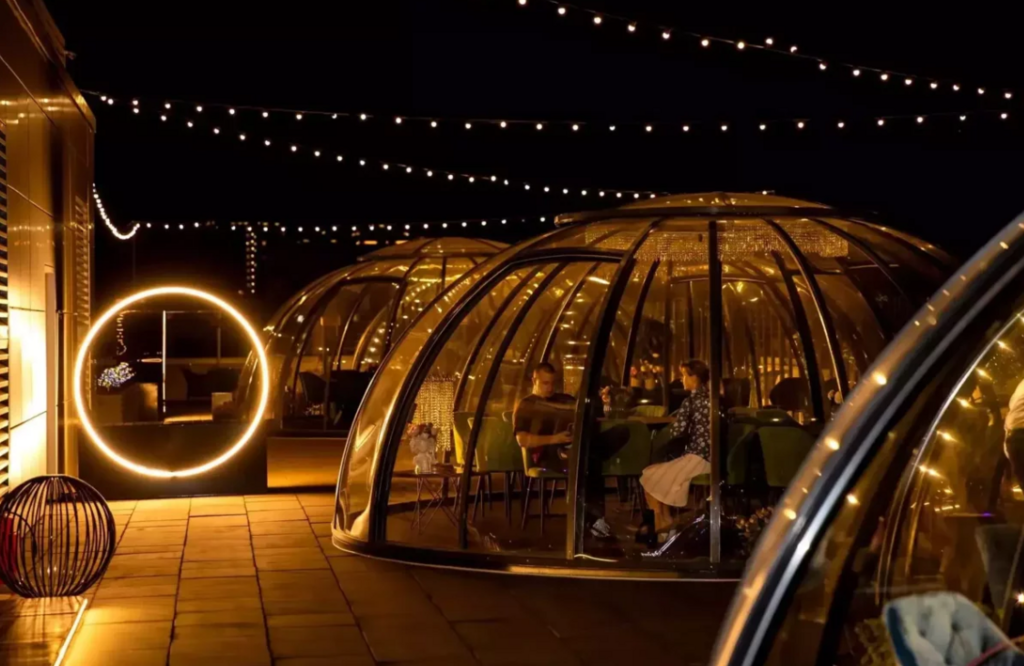 Igloobar предлагает необычный формат ужина на крыше — уютные купольные беседки с панорамным видом на город. Это пространство идеально подходит для частных ужинов, фотосессий, свадеб и корпоративов. Беседки оборудованы для комфортного отдыха круглый год: в них всегда тепло зимой и прохладно летом.
