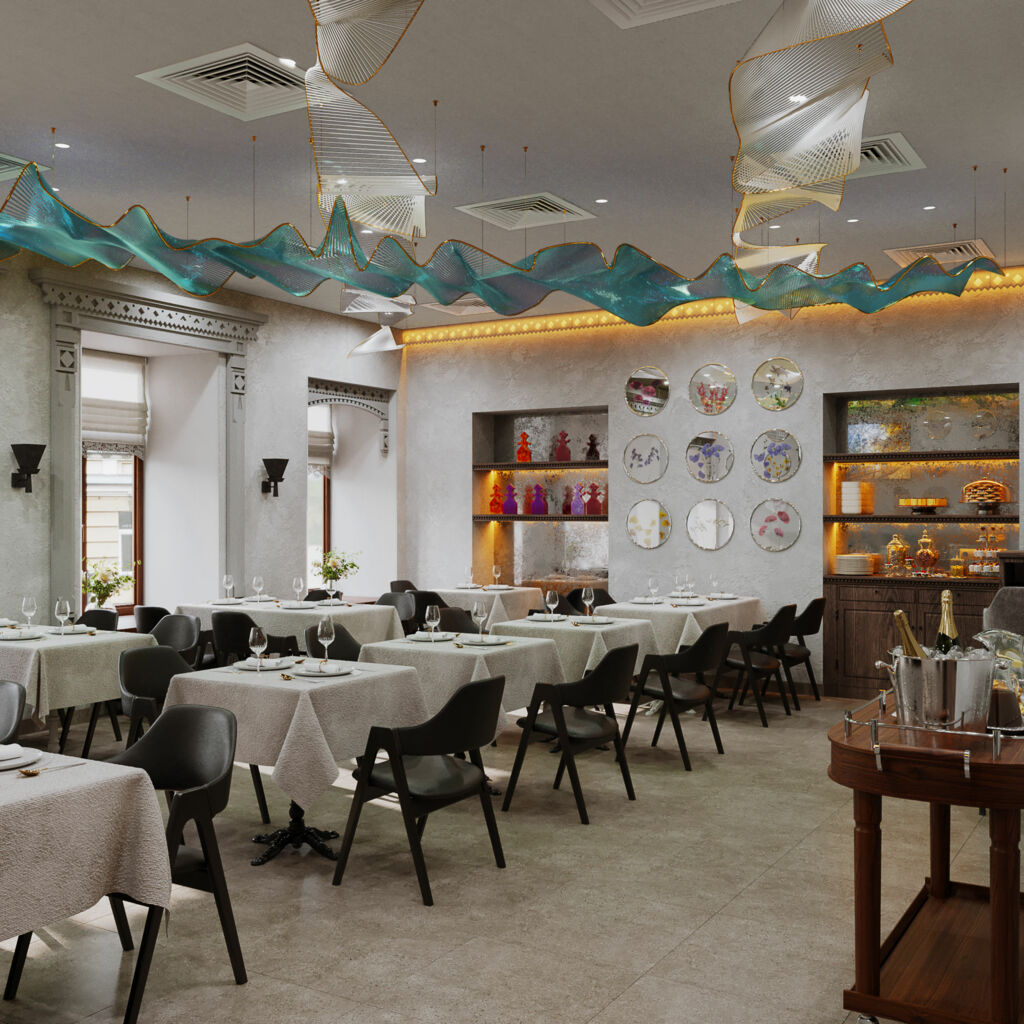 Просторный и светлый зал ресторана идеально подходит для проведения мероприятий любого формата. Интерьер имеет стильный дизайн, гармонично сочетающий элементы русского декора, что создает неповторимую атмосферу, объединяющую традиции и современность. Уникальные световые инсталляции в интерьере ресторана завораживают игрой света и дарят гостям возможность насладиться волшебством северного сияния прямо в центре Москвы.