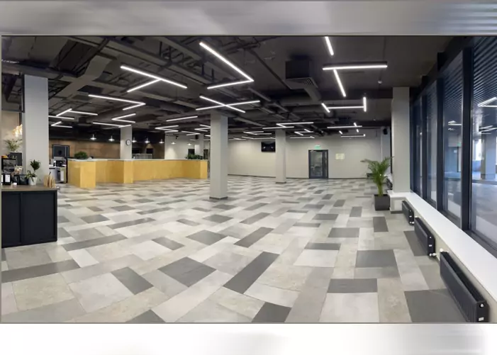 Просторный чистый светлый зал со свежим ремонтом в современном стиле, панорамными окнами и верандой.
