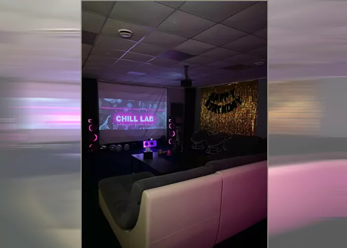 Современный дизайн с неоновыми акцентами и амфитеатром с большим экраном и отдельным входом