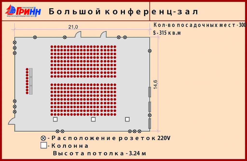 Общая площадь Большого конференц-зала – 315 кв.м., высота потолка – 3,20 м., максимальная вместимость – 300 человек (расстановка «театр»). Для комфорта гостей зал оснащен индивидуальной системой кондиционирования. Обеспечить успех мероприятия поможет современное профессиональное техническое оснащение: проекционное, интерактивное и аудиовизуальное оборудование, системы звукоусиления. Предоставляется доступ в Интернет как через бесплатный Wi-Fi, так и посредством выделенной линии.
