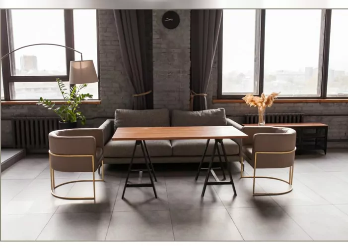 Лаконичный стильный зал в серых тонах с 2-мя панорамными окнами в виде современной квартиры. Стиль – лофт и минимализм.