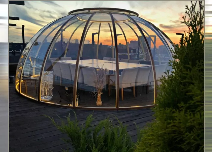 Прозрачная купольный большой круглогодичный шатер с обзором 360 градусов, расположенная на террасе 100 м² одной из самых известных крыш Москвы.