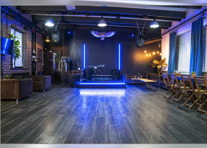 Просторный зал с 2 окнами, визуально разделенный на две зоны: танцпол, сцена, бар и лаунж-зона с журнальными и фуршетными столами.