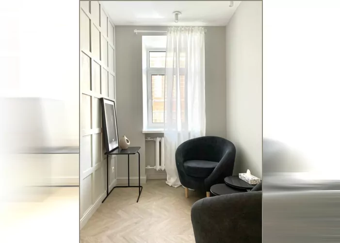 Небольшой кабинет в светлых тонах с уютными контрастными креслами. Спокойный декор позволяет сосредоточиться на беседе, а из окна открывается красивый вид на Большую Якиманку. Также в кабинете есть торшер и небольшой компьютерный столик для проведения онлайн консультаций (просьба использовать наушники для более комфортной работы онлайн).