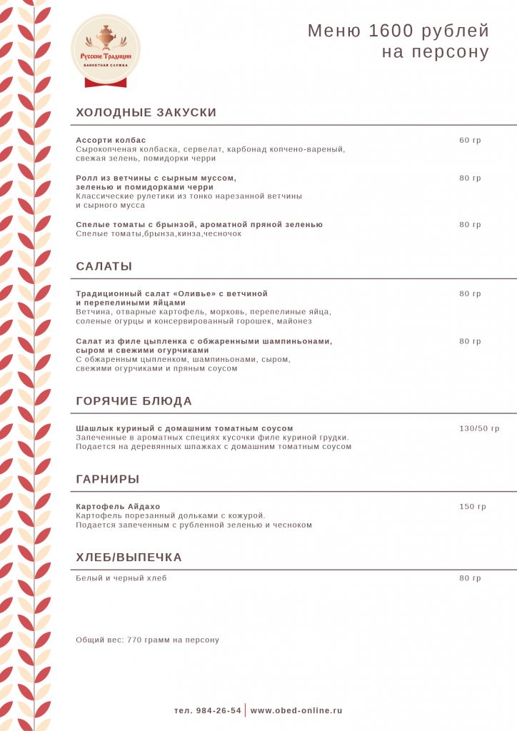 - Банкетное меню от 1600 рублей на персону