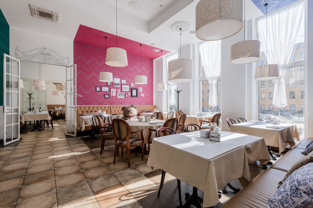 Заведение входит в состав хорошо известной в Санкт-Петербурге сети. Интерьер в полной мере соответствует названию кафе. Пространство разделено на три зала, стилизованные под комнаты обычной квартиры. Элегантные стулья и мягкие диваны, старинные комоды и абажуры, фотографии и обрывки газет на стенах придают обстановке дополнительный домашний уют. Из огромных панорамных окон открывается вид на местные достопримечательности.