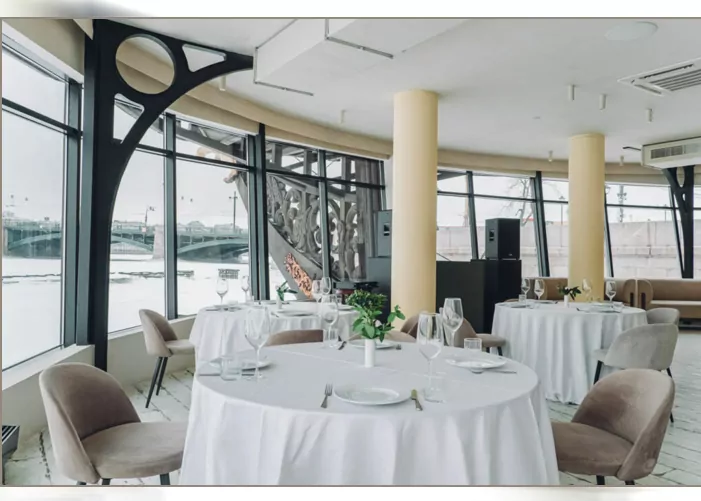 Спускаясь по трапу корабля, гости попадают на его первый этаж, откуда виднеется проход на самую красивую веранду Петербурга. Поддаемся искушению и проходим. Вот оно, идеальное место для летних open-air событий, где симфония петербургских улиц сменяется криками чаек и шумом прибоя волн Невы. Провести здесь день рождения, свадьбу или светский бизнес-завтрак до 120 человек в формате банкета - мечта поклонников неспешных круизов. Только представьте, какой захватывающий дух вид открывается за бортом: Ростральные колонны на противоположном берегу, знаменитые разводные мосты, ради которых съезжаются миллионы туристов, и, конечно, река. Непередаваемое ощущение!