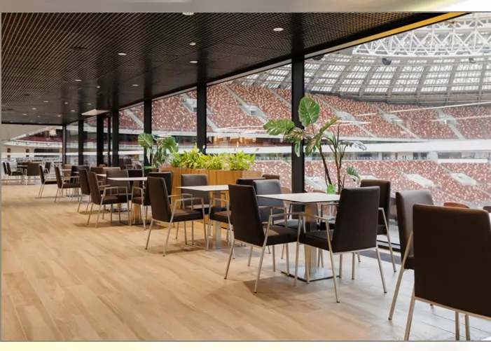 Витая лестница в центре площадки станет для фотосессий и создания ярких воспоминаний, а панорамные окна и прямой выход на трибуну Большой спортивной арены создадут незабываемую атмосферу для гостей.