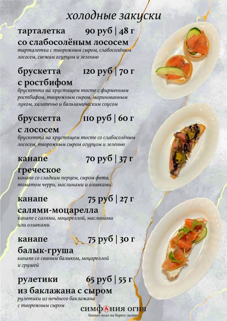 В распоряжении “Симфонии огня” три основных зала для малых и больших компаний. Закрытая парковка для гостей позволяет вместить до 10 машин.
