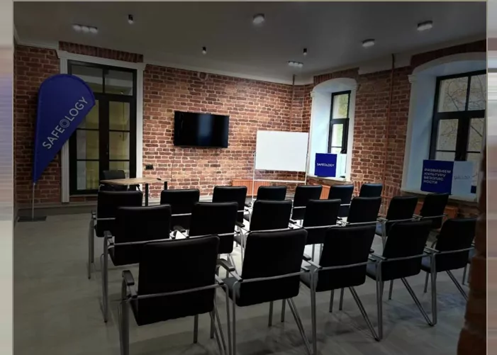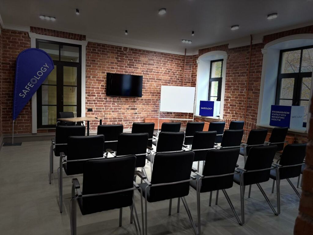 SAFEOLOGY Hall — современное пространство с лофт-атмосферой, идеально подходящее для обучения, презентаций и корпоративных мероприятий.