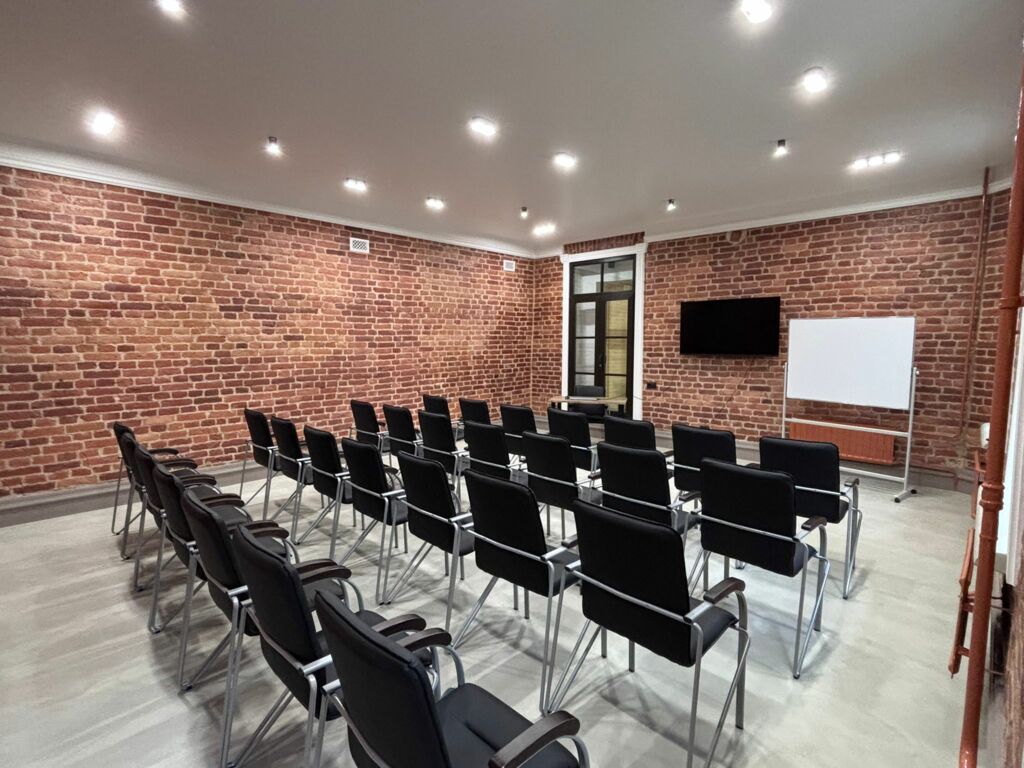 Современный экран HDMI, флипчарт, мобильная мебель, возможность расстановки под тренинг или лекцию.